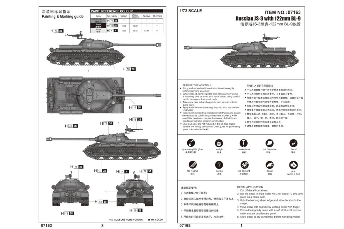 07163 | Trumpeter 1/72 Russian JS-3 W/ 122mm BL-9 Tank Scaled Plastic Model Kit
